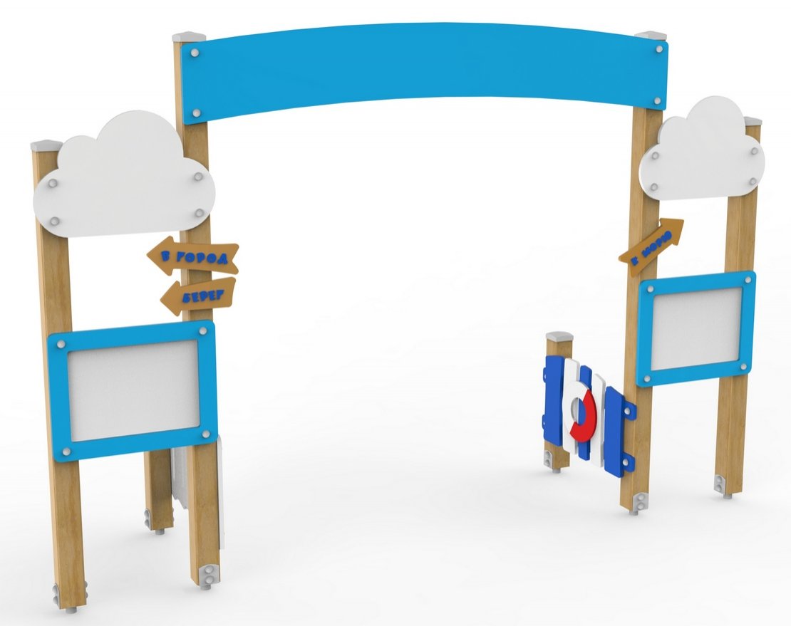 Арка Нептун 1 состоит из четырех опорных стоек, двух информационных щитов и трех декоративных панелей. Арка устанавливается при входе на детскую площадку.