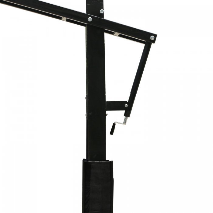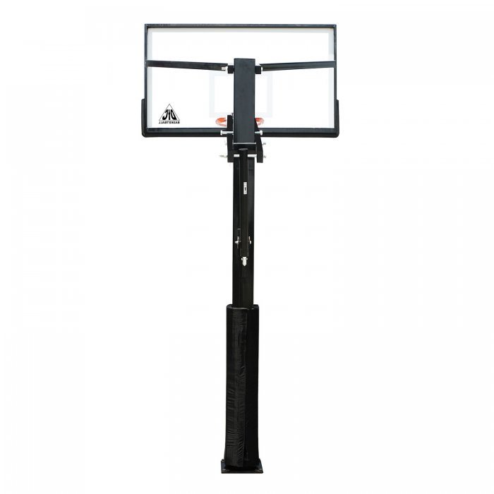 Щит изготовлен из закаленного стекла толщиной 10 мм и имеет размерность 180 х 105 см (72’’). По периметру щит имеет кант из металла. В нижней части щита и на стойке установлено защитное покрытие Poly Pade. Стойка комплектуется кольцом с амортизацией, которое выдерживает нагрузку до 300 кг в передней части. Бесступенчатая регулировка высоты с помощью ручки в диапазоне от 245 до 305 см.