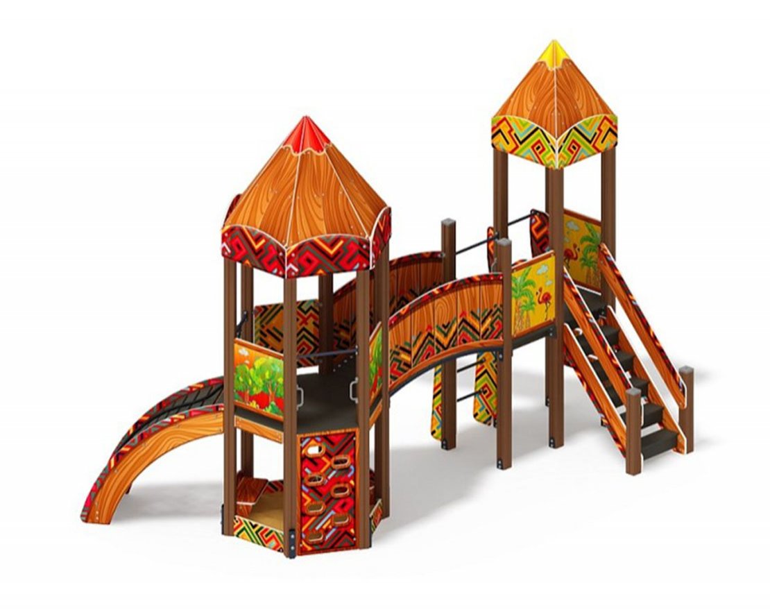 Спаренная башня из шести клеёных брусьев 100х100 мм высота 3000 мм-4 шт. и 2200 мм- 2 шт.; полы из ламинированной фанеры, с анти-скользящим покрытием 1460х780мм толщиной 18мм. Башня состоит из двух частей, над частью с горкой имеется четырёхскатная крыша из фанеры толщиной 12 мм, кромки фанеры тщательно шлифованы, фанера окрашена с нанесением принта. Башня украшена стилизованными декоративными арками (780х380х18мм) и четырехскатной крышей, крыша поставляется в сборе и выполнена из влагостойкой фанеры толщиной 12 мм (габариты в сборе 770х770х740мм), кромки фанеры тщательно шлифованы, окрашены с нанесением принта. Отметка пола башни от планировочной отметки площадки 1200мм. Высота башни 3740 мм.