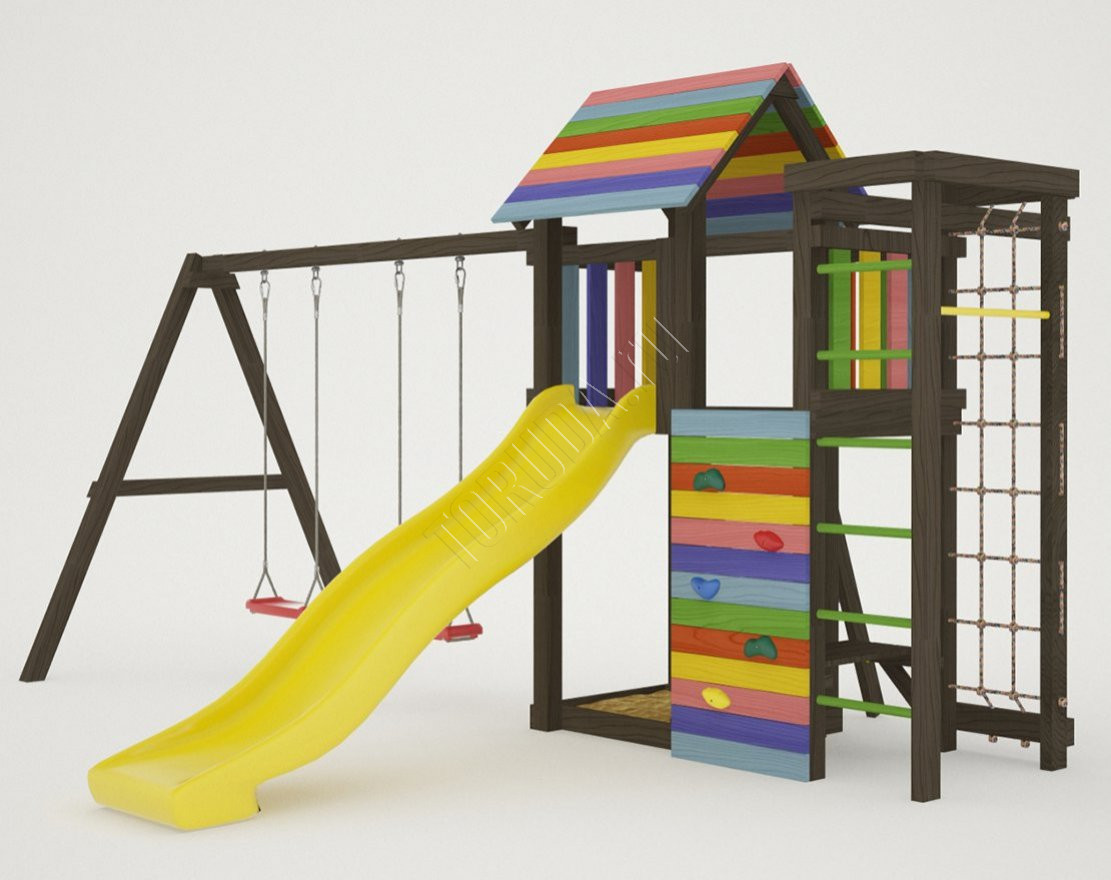 - Это универсальное решение для активного досуга и позитивного настроения непосед с трех лет. Комплекс безопасен – конструкция, качество древесины и подвижных элементов соответствуют ГОСТ. Основным материалом является экологичный клееный брус, балки которого отшлифованы и имеют закругленные края.