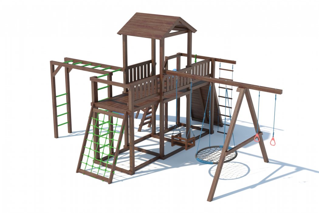 Основа детской игровой - спортивной конструкции - башня с террасой и игровой платформой. Конструкция оснащена двускатной деревянной крышей, пластиковым волнообразным скатом с превосходной скользящей поверхностью, деревянной лестницей, широким скалодромом, канатной лестницей, деревянным рукоходом, шведской стенкой, приставными качелями, сидением качели «гнездо», сидением качели «малютка», гимнастическими кольцами, подвесной лестницей. Для безопасности ребенка предусмотрены перила на лестнице, заборчики и ограждения над зонами препятствий (скалодром, канатная лестница, скат).