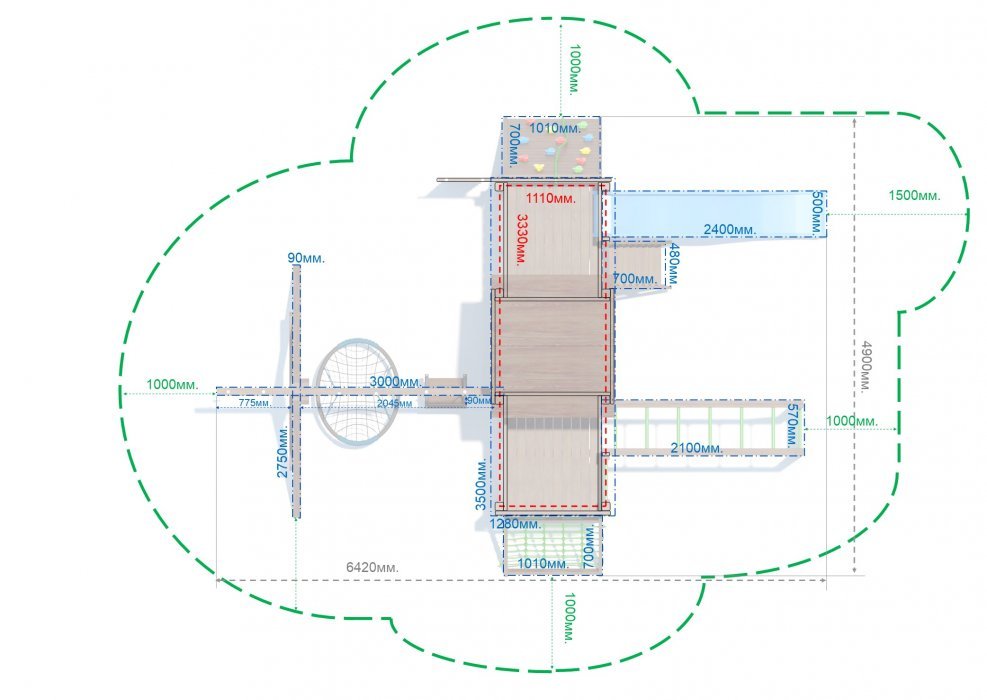 Площадь поверхности детской площадки = габариты конструкции по крайним точкам + 1000/1500мм. по периметру конструкции. Поверхность должна быть твердой, ровной, свободной от насаждений, горизонтальной без перепадов, допустимый уклон не более 20мм. на 10п.м.