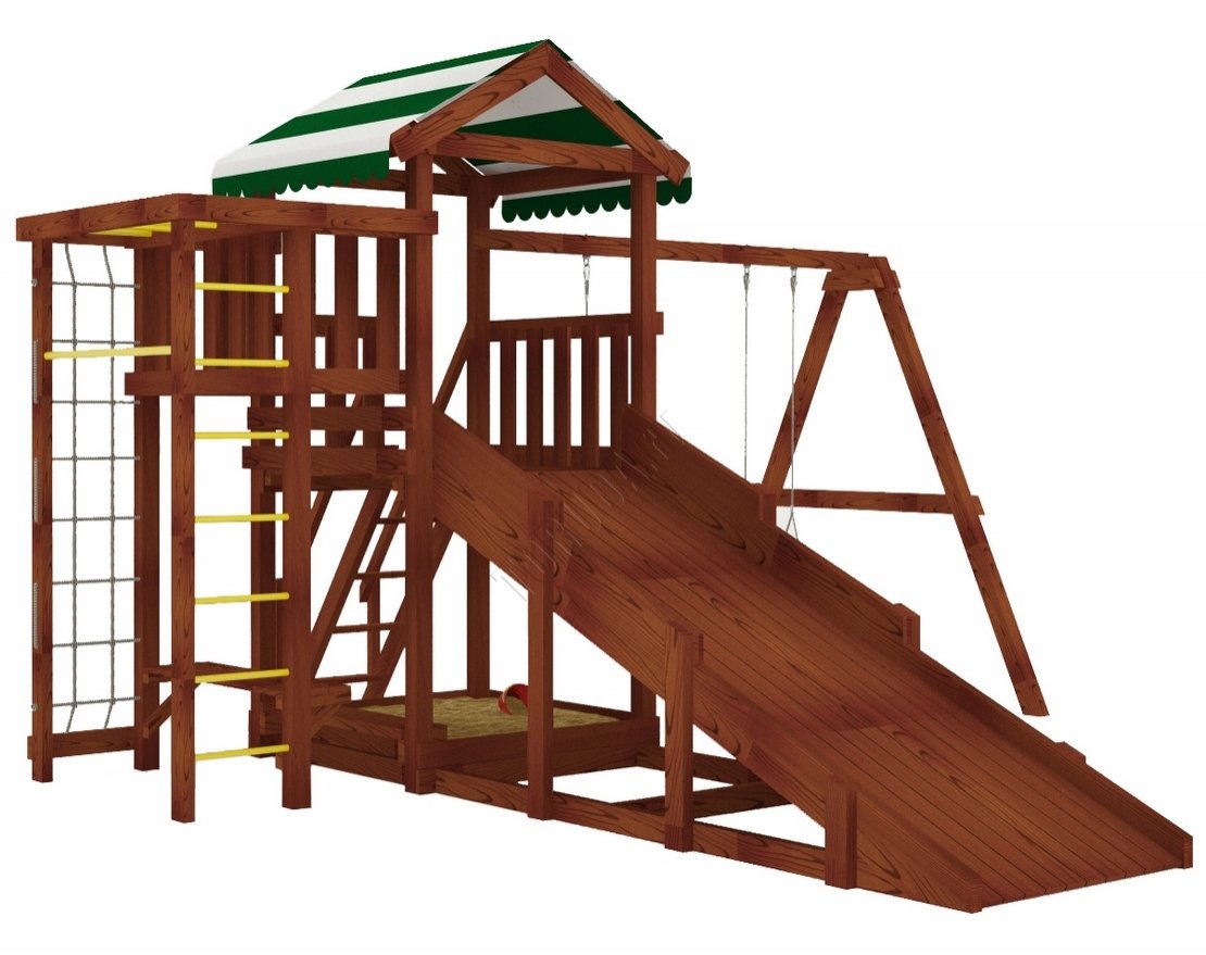 Конструкция сертифицирована и безопасна. Крепежи скрыты под хорошо закрепленными заглушками – поэтому даже малыши не поранятся. Каркас состоит из натуральных деталей – клееного бруса квадратного сечения со стороной 75 мм. Во избежание получения заноз и ссадин дерево отшлифовано, а края скруглены.