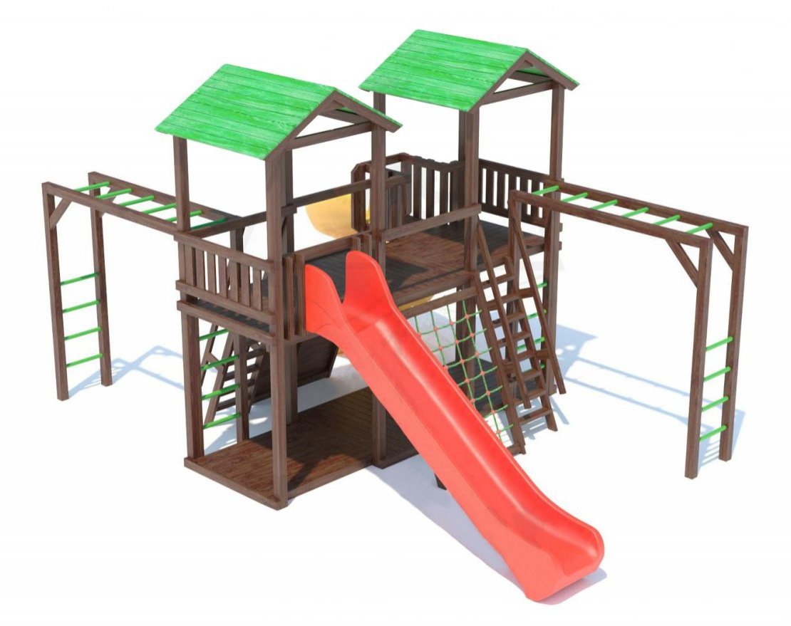 Основа детской игровой конструкции (конструктор) – две башни со статичным мостом «серия D». Конструкция оснащена двумя двускатными деревянными крышами, встроенным полом, пластиковым антивандальным скатом с превосходной скользящей поверхностью, антивандальным винтовым скатом с переходным мостиком, скалодромом, канатной лестницей с армированным канатом, двумя «П»-образными рукоходами, двумя деревянными лестницами. Для безопасности ребенка предусмотрены перила на лестнице, заборчики и ограждения над зонами препятствий (скат).
