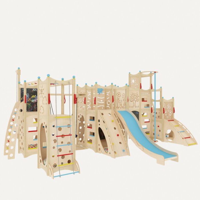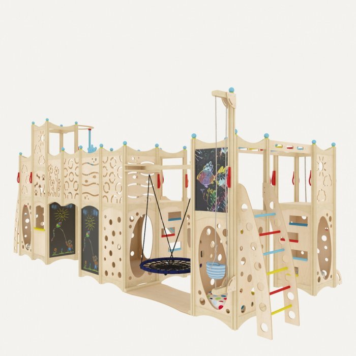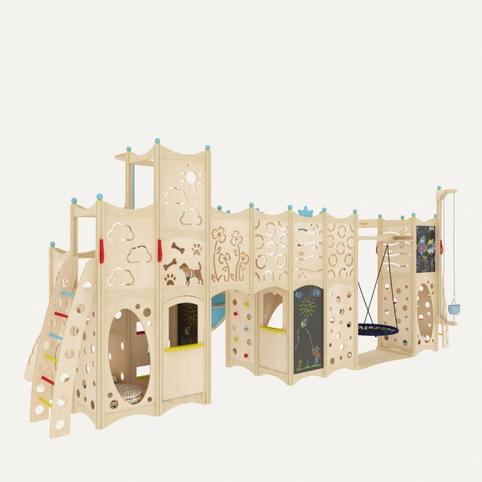 Конструкция состоит из 4 частей, которые объединяются с помощью мостиков, подвесных модулей в виде качелей и т.д. Каждый из них оборудован спортивно-развлекательными модулями: горкой, верёвочной лестницей, лесенкой, качелями, рукоходом, шестом.