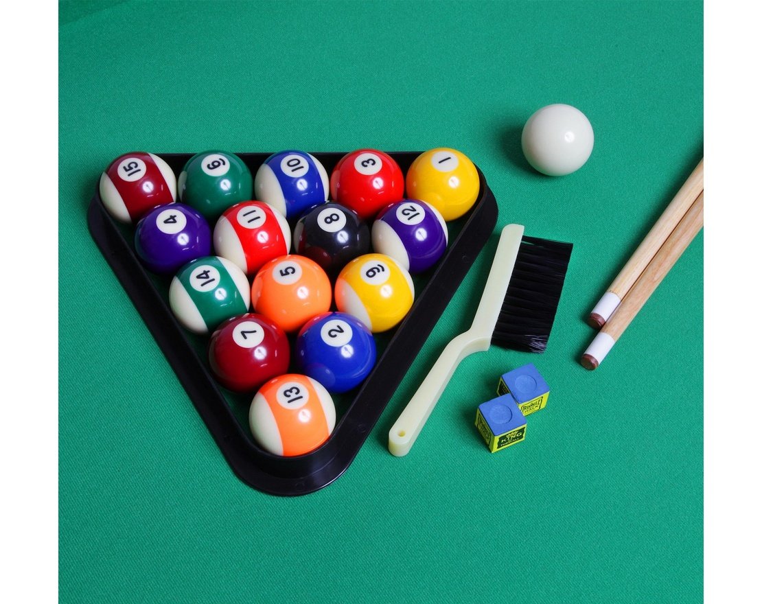 Модель поставляется с комплектом всех необходимых для игры аксессуаров: двусоставные кии (2 шт.), набор из 16-ти шаров, два мела, треугольник и щетка для ухода за поверхностью сукна.