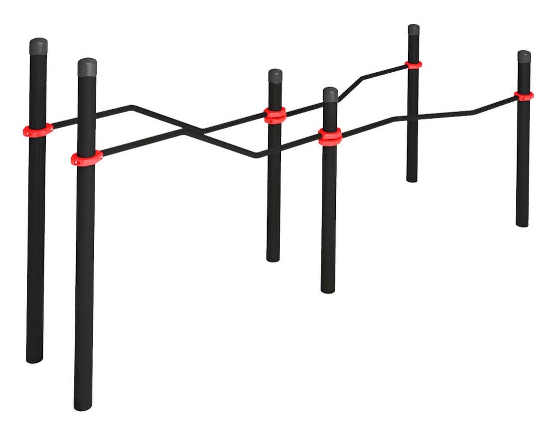 Комплекс состоит из шести опорных столбов высотой: 2 шт. - 1530 мм, 4 шт. - 1200 мм и четырех зигзагообразно изогнутых жердей длиной 1790 мм. Расстояние между центрами опорных столбов брусьев 608 мм - с одной стороны и 1008 мм - с другой стороны. Жерди крепятся к опорным столбам при помощи хомутов на высоте: 1200 мм в верхней части и 1000 мм в нижней части от поверхности основания. Длина комплекса не более 4200 мм.